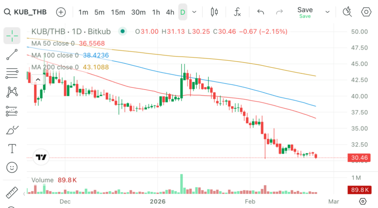 สถานการณ์ของ KUB Coin เหรียญหลักประจำเครือข่าย Bitkub Chain ในวันนี้ (23 กุมภาพันธ์ 2026) กำลังเป็นที่จับตามองของเหล่านักลงทุนไทย หลังจากกราฟราคาได้ร่วงลงมาซื้อขายอยู่ที่ระดับ 30.46 บาท หรือคิดเป็นมูลค่าที่ร่วงลงกว่า 2.15% ในช่วง 24 ชั่วโมงที่ผ่านมา